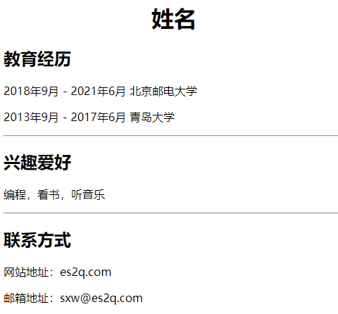 可通过“center”标签使姓名居中显示。可使用“hr”元素在每两个标题之间显示水平分隔线。完成后的代码如下所示。