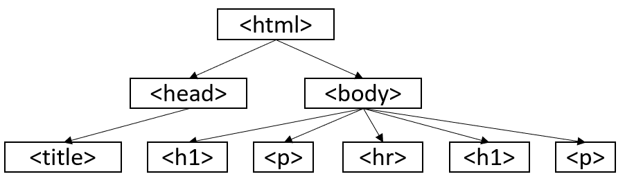 上面代码3个层次,<html>标签是最外层的元素。下面是<head>和<body>,其中又有各自的内容,他们构成了树形结构。如下图: