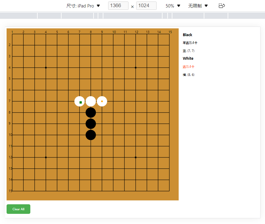 在浏览器中打开,若使用开发者工具模拟iPad Pro的竖屏状态的屏幕,可以看到程序正确提示出了窗口的大小,并 判断出屏幕高度大于宽度,可以根据这样的判断结果对屏幕进行不同的布局处理。