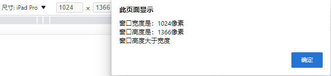 下面代码使用alert方法在对话框中展示了当前窗口的宽度和高度。