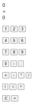计算器界面由“输入区”、“结果区”、“数字输入按钮”、“运算符输入按钮”和“功能按钮”组成。用户点击输入按钮后,输入区显示已输入内容,结果区则输出计算结果。数字输入按钮是0到9共10个数字以及负号、小数点。运算符有加减乘除、阶乘、根号和平方。功能按钮有等号和清除按钮(C按钮)。