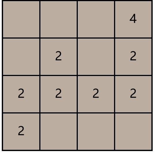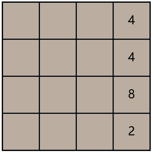 以向右合并为例,合并的操作可以描述为,先把棋盘格上所有的数字都尽量往右移动,即如果一个数字的右侧有空格格子则把数字移动到这个格子。然后如果一个数字右侧紧邻一个相同数字,则把当前数字加到右侧数字上,当前数字的格子清空。如下图: