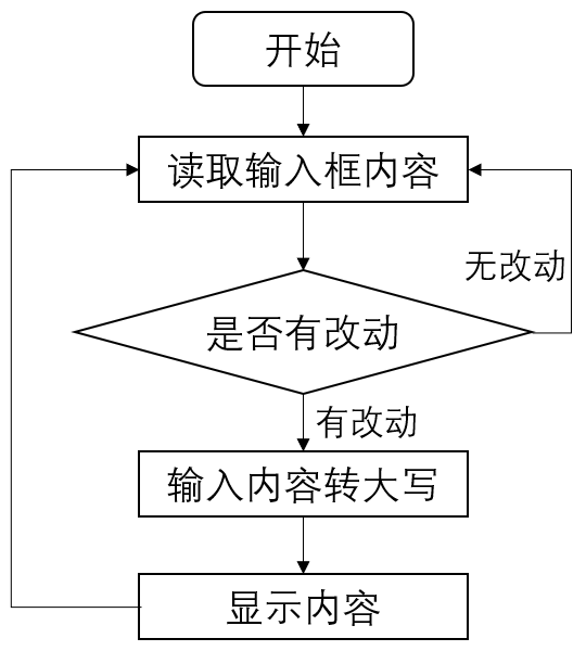 如果按照完全同步的方法来实现程序,组织这些事件或动作的方法可以用下图表示。程序要不停的读取输入框的内容,如果输入框内容没有变化,就继续在读取和检查,因为用户随时可能编辑输入框中的内容,所以要保证显示结果的实时性,就必须不停的检查。若发现输入内容变化则将输入字符串中的字母转换成大写,更新显示内容,然后继续检查用户输入有没有新的变化