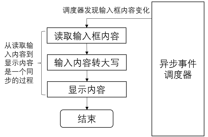 以上程序流程很简单,但事实上,异步情况下的循环和判断的部分都由系统“代劳”了。在同步的情况下,系统只需要一步一步地执行程序即可。在异步情况下,系统要负责查看输入框的内容有没有变化,如有变化,则调用读取输入框内容的程序。当读取成功后,调用字母转换大写的程序,转换完成后,调用显示内容的程序。