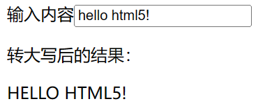 假设要实现把用户输入的字符串中的字母转成大写显示出来,将非字母的字符原样输出,比如用户输入“abc123!”,输出“ABC123!”;还要实时显示结果,即输入或修改了内容要马上显示对应结果。下面的代码创建了一个输入框和一个用于输出大写结果的<P>标签。