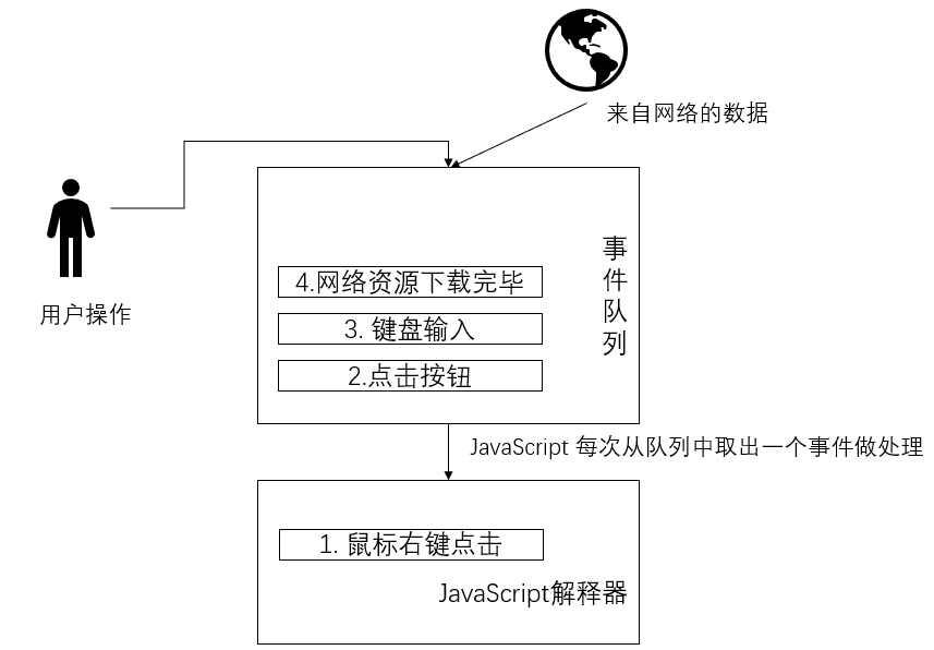 可以认为JavaScript中存在一个事件队列。各个来源的事件都进入这个队列中,按一定的顺序排队。JavaScript解释器每次从事件队列中取出一个事件执行,执行完毕后再取另一个事件执行。如下图: