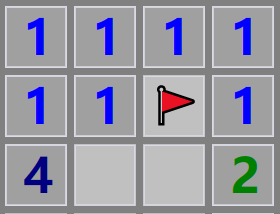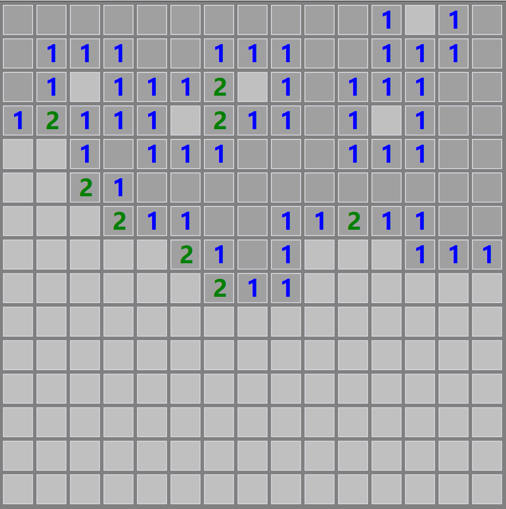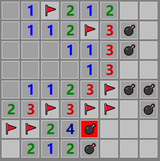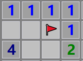 每个空白方格都可能有地雷或没有地雷。没有地雷的方格可分为直接与有地雷方格相邻的方格(包括斜对角相邻)和不直接与有地雷方格相邻的方格。下图展示了过关后的游戏界面,图中的旗子符号是玩家用以标记地雷的。空白的方格(如左上角的方格)是既没有地雷,也不靠近地雷的方格。靠近地雷的方格(包括斜角相邻)中会显示一个数字,它是当前方格周围8个方格中地雷的数量。方格中的数字可以是1——8的任意一个数字。