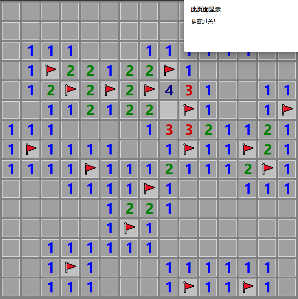 下图展示了过关时的提示,此时用户右键点击了图中提示数字“4”下方的最后一个空格子,页面弹出提示框。玩家点击确定后,旗子符号被显示在右键单击的位置。
